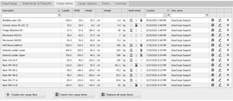 Under the tab Cargo items you can easily add, import, and maintain a database of cargo items: