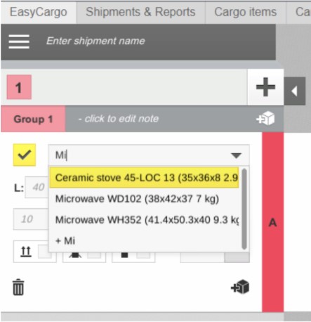 In EasyCargo, the items from the database can simply be added to the load plan by entering part of the cargo item's name in the description of the item, and then all of the item's properties will be prefilled automatically from the database: